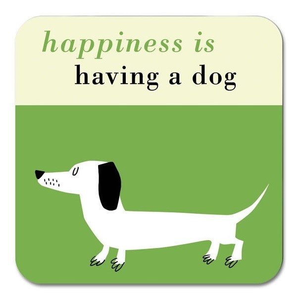 Happiness is Having a Dog. Sausage Dog Coaster in Green from the Happiness Collection by Repeat Repeat.Satin melamine surface on a sustainable eucalyptus board, with a black baise backing.