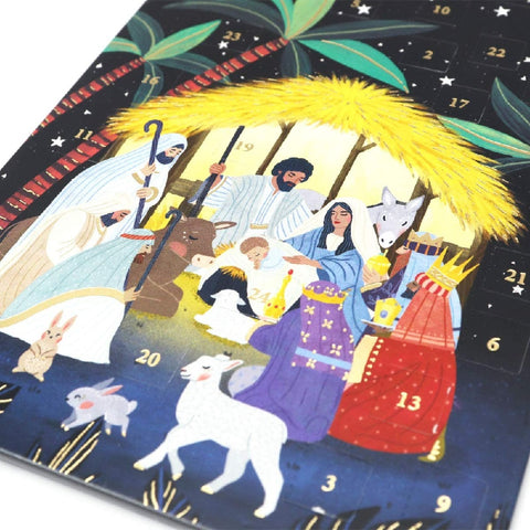 Christmas Advent Calendar Card with 24 die cut windows to reveal delightful festive images, one window to be opened each day from the 1st December to Christmas Eve.Card size 17 x 12 cm with gold foil decor.