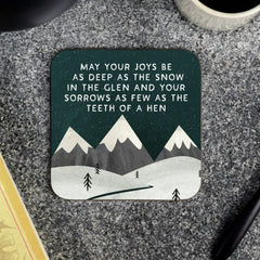 "May ye ne'er want fir a frien' or a dram to gie them". 9cm x 9cm hard backed coaster w...