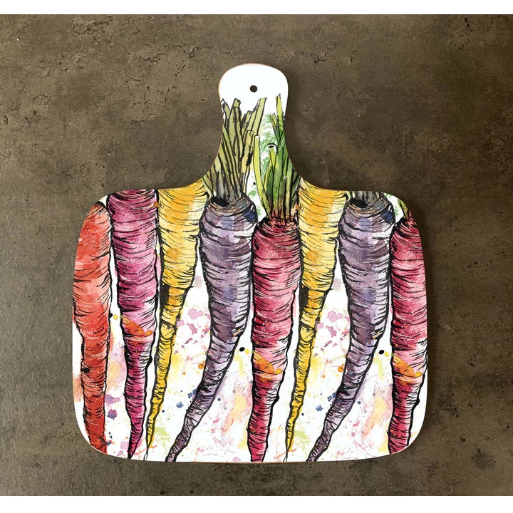 Chopping board with beautiful colourful carrots design. Handmade in the UK, with a sustainably sourced Eucalyptus board base, a matt finish melamine surface, with a laminated wood effect backing. Comes with handle with hole for hanging. Size: 292 x 254mmDescription