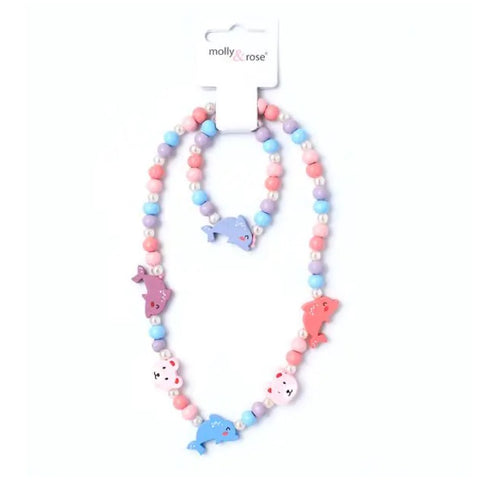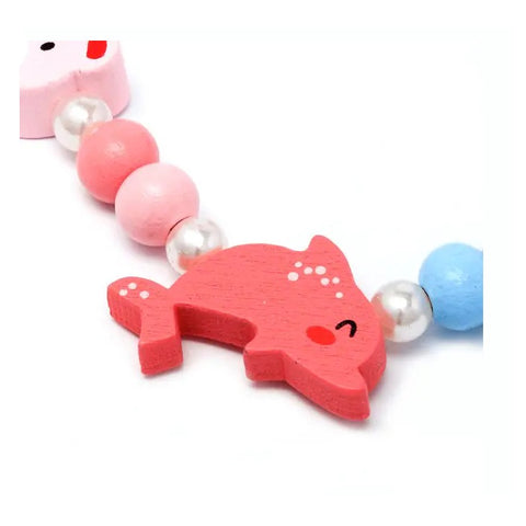 Children's stretch wooden and plastic pearl beaded necklace and matching bracelet set with dolphin and teddy charms1 necklace and 1 bracelet sent per order