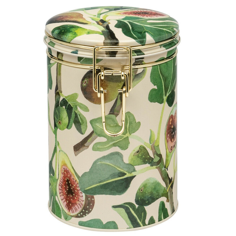 Emma Bridgewater Figs Design Clip Lid Caddy. . Made from steel, this caddy is great for storing tea and coffee or anything else that requires an air tight container. . Size: 11cm diameter and16.5cm tall.Description