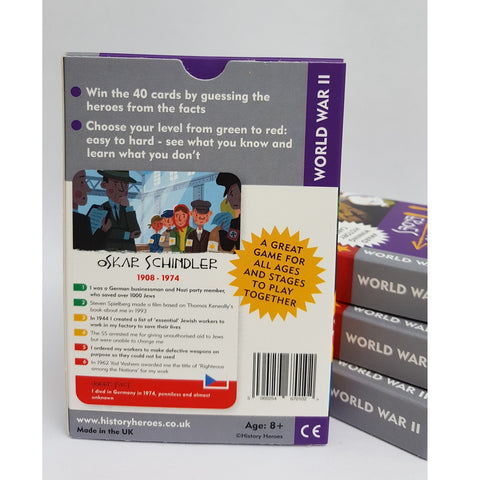 Award winning, pocket-sized card game for all ages - from 8 to 80+- about who made and shaped World War Two: the heroes and the anti-heroes , leaders, resistance fighters and groups, such as Kindertransport.40 fantastically illustrated cards detailing 40 of the most significant characters in World War Two.