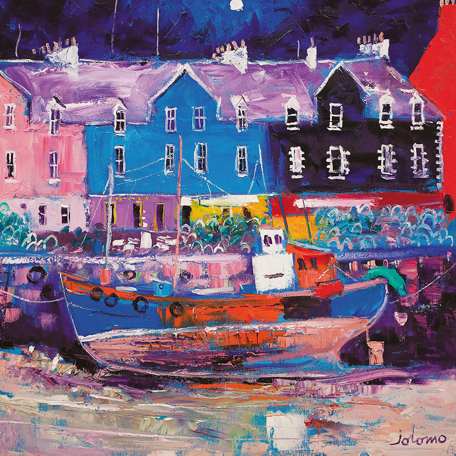 Pot Stand featuring Beached Fishing Boat, Tobermory - as painted by John Lowrie Morrison O.B.E.The stand has a heat resistant melamine surface and a cork back.