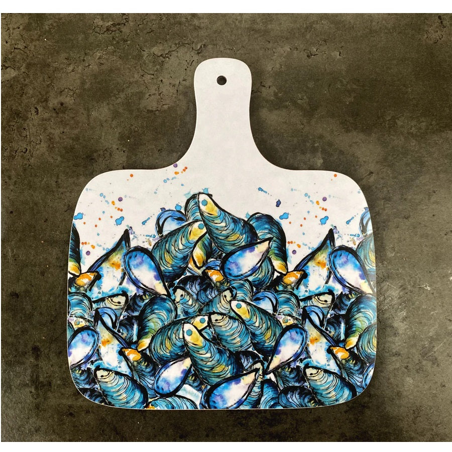 Chopping board with beautiful, colourful mussels designHandmade in the UK, with a sustainably sourced Eucalyptus board base, a matt finish melamine surface, with a laminated wood effect backing