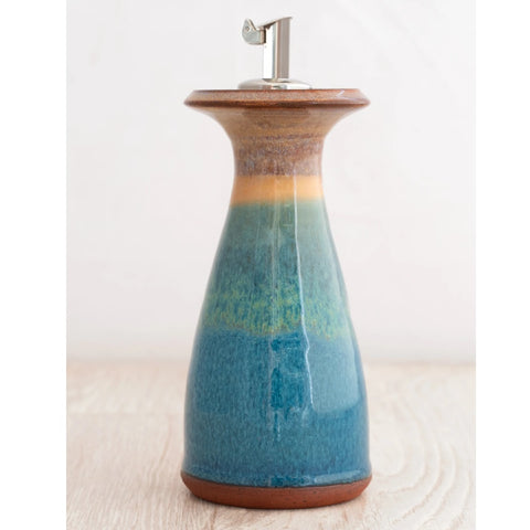 An Olive Oil Decanter, just short of 13cm in height. Perfect for drizzling over salads, with a stainless steel flip top pourer. . Holds approximately 150ml. . Each piece is made on a potters wheel and hand glazed, therefore size and colours may vary slightly.. Supplied gift boxedDescription