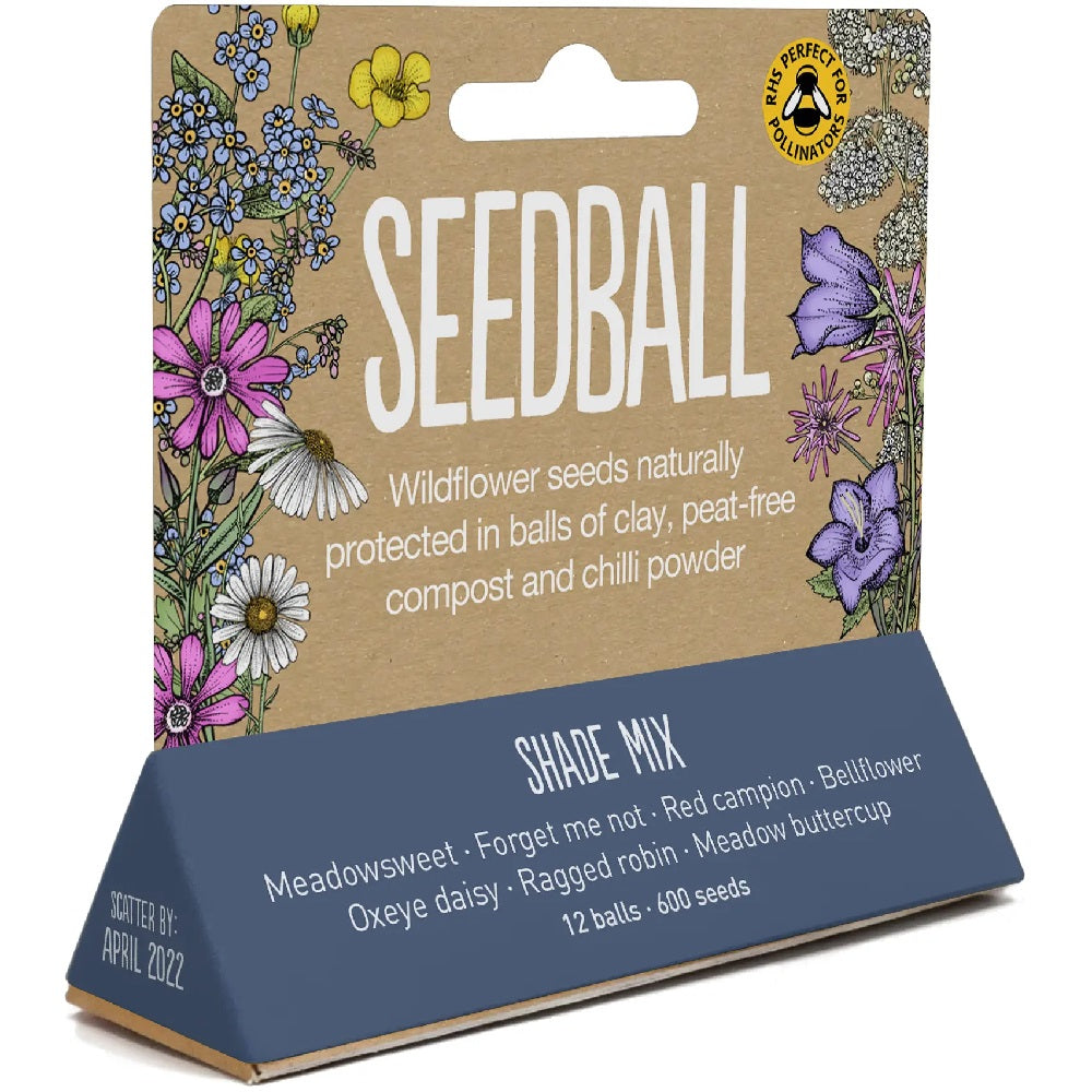 A mix of British native wildflowers that are ideal for shadier areas of your garden and balcony. While these will struggle in total shade (as would all flowers!), this mix is designed for spots which receive only dappled sun or sun for just one part of the day (although will grow equally well in areas of full sun). Each ball contains approximately 30 seeds from a mixture of Bellflower, Forget-me-not, Meadow buttercup, Meadowsweet, Oxeye daisy, Ragged robin and Red campion.Each tube of Shade Mix contains 12 seed balls, enough to cover 1 metre square in a garden bed or 3-5 medium sized pots (leave at least 10cm between each ball). Best scattered in Spring or Autumn.
