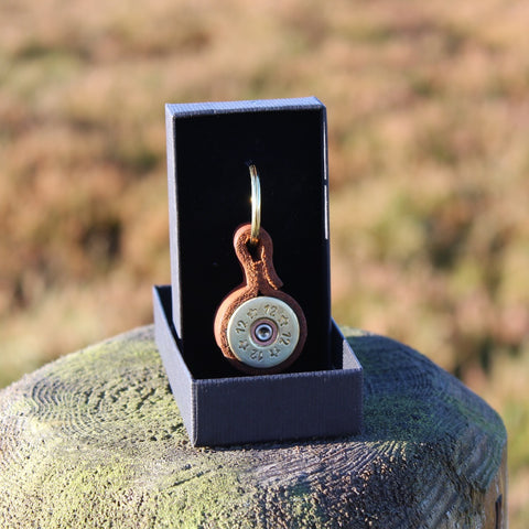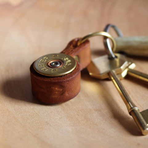 This uniquely designed keyring is handmade from two 12 bore shotgun cartridges wrapped in leather and riveted together to create a neat strong piece.As this product is handmade and hand dyed each one will vary slightly in colour.