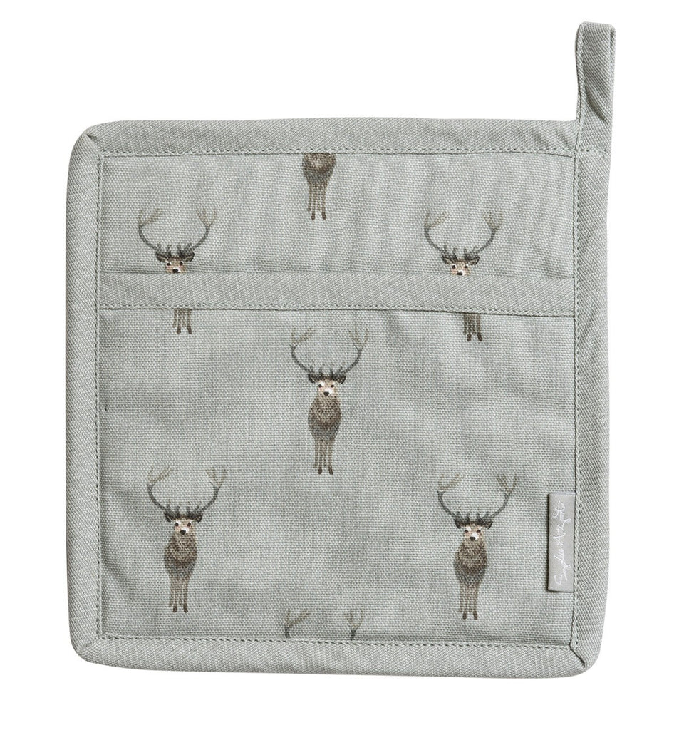 A brilliantly useful kitchen accessory, this Highland Stag Pot Grab will protect your hands while lifting hot pans and dishes. Made from 100% cotton it is hard wearing and the internal padding gives you excellent insulation.This little hand sized mitt would make a lovely gift and look perfect in any country kitchen.
