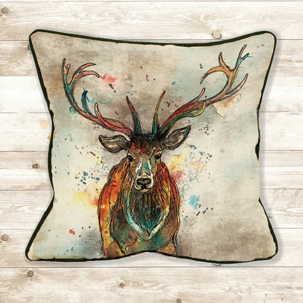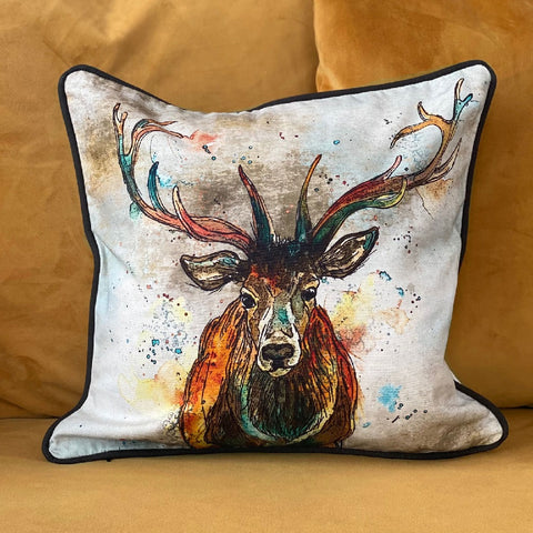 Beautiful Stag design cushion with contasting piping around the edges. Cover made from 100% unbleached cotton, Lovely vibrant print on both sides and Machine washable at 40 degrees. Zip fastening. Size: 43 x 43 cmDescription