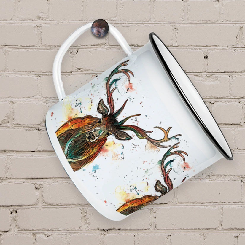 Enamel mug with stainless steel rim featuring Beautiful Stag image printed all aroundLightweight and durable - perfect for camping, hiking, gardening, beach days or just to look lovely in your kitchen.