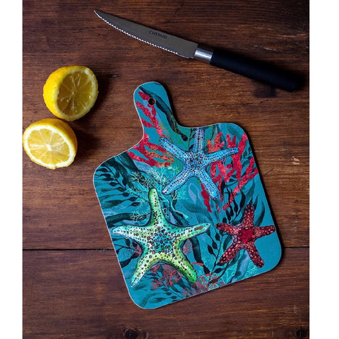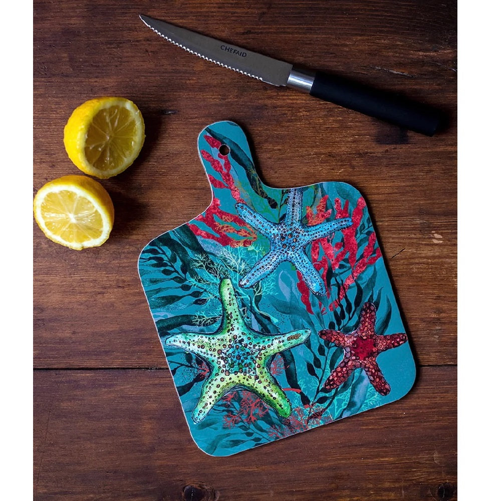 Small chopping board with beautiful watercolour starfish designHandmade in the UK, with a sustainably sourced Eucalyptus board base, a matt finish melamine surface, with a laminated wood effect backing