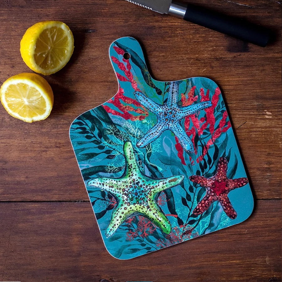Small chopping board with beautiful watercolour starfish design. Handmade in the UK, with a sustainably sourced Eucalyptus board base, a matt finish melamine surface, with a laminated wood effect backing. Comes with handle with hole for hanging. Matching items also availableDescription