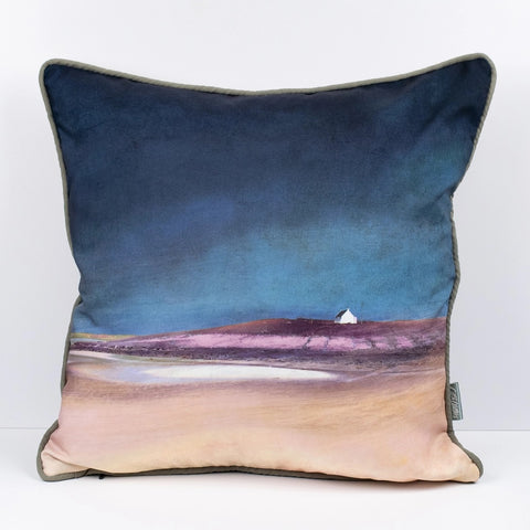 A luxury 18" x 18" cushion with a high quality hollow fibre inner pad . Cath’s Scottish landscape art on the front with soft grey cotton backing and matching piping. Zip fastening along bottom edge. Each cushion is printed and stitched in the UK. Cool wash and iron on the...