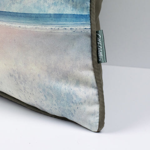 A luxury 18" x 18" cushion with a high quality hollow fibre inner padCath’s Scottish landscape art on the front with soft grey cotton backing and matching piping. Zip fastening along bottom edge. Each cushion is printed and stitched in the UK. Cool wash and iron on the reverse. 50% cotton, 50% polyester.